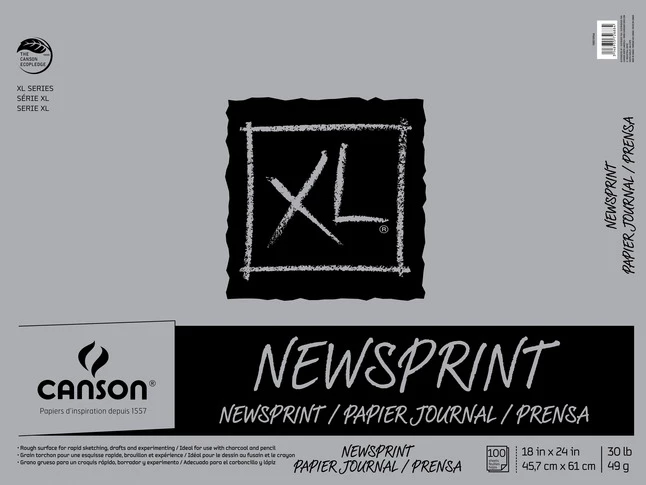 Canson Biggie Newsprint Pad is used for preliminary sketching in pencil or charcoal and is perfect for practicing drawing techniques. Rough textured pad with tape bound measures 18 x 24 inches and contains 100 sheets of 30 lb basis weight paper.
