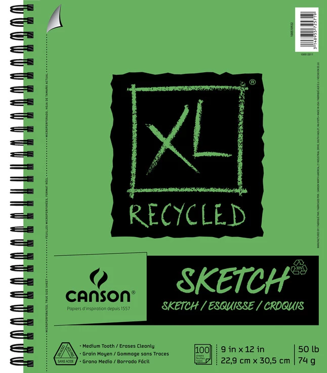 Canson XL Recycled Sketch paper contains 30% post-consumer content and erases cleanly. Medium-tooth paper is ideal for pencil or pen and ink. Wire-bound pad contains true-size, microperforated sheets. 50 lb. Pad measures 9 x 12 inches and contains 100 sheets.