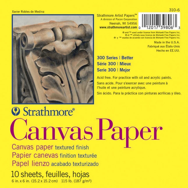 Great for sketching and practicing techniques, Strathmore’s 300 Series Canvas Paper offers a white classic canvas texture for oil and acrylic paints. Glue-bound 6 x 6 inch pad contains 10 sheets of 115-lb. paper.