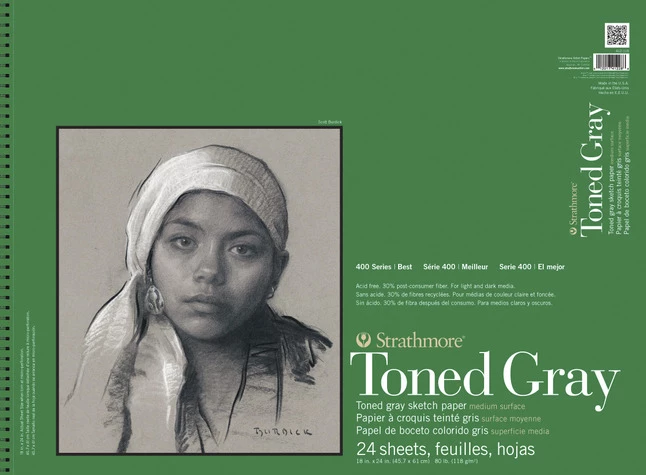 Strathmore 400 Series Toned Gray Pad is ideal for light and dark media. Great for sketching with graphite, chalk, charcoal, sketching sticks, china markers, colored pencils, pens and white gel pens. 100 percent recycled, contains 30% post-consumer fiber, acid free. Pad measures 18 x 24 inch and contains 24 sheets.